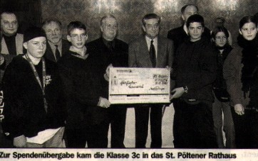 Die furchtbarsten Weihnachten erlebten wohl die Opfer der Gasexplosion in Wilhelmsburg. Ihnen wird, so entschieden die Hauptschüler nach der Aufführung, die gesamte Spendensumme in der Höhe von 15.000 Schilling zugute kommen. Der von der Bezirksleitung des Jugendrotkreuzes aufgerundete Betrag wurde an Bürgermeister Walter Daxböck übergeben.